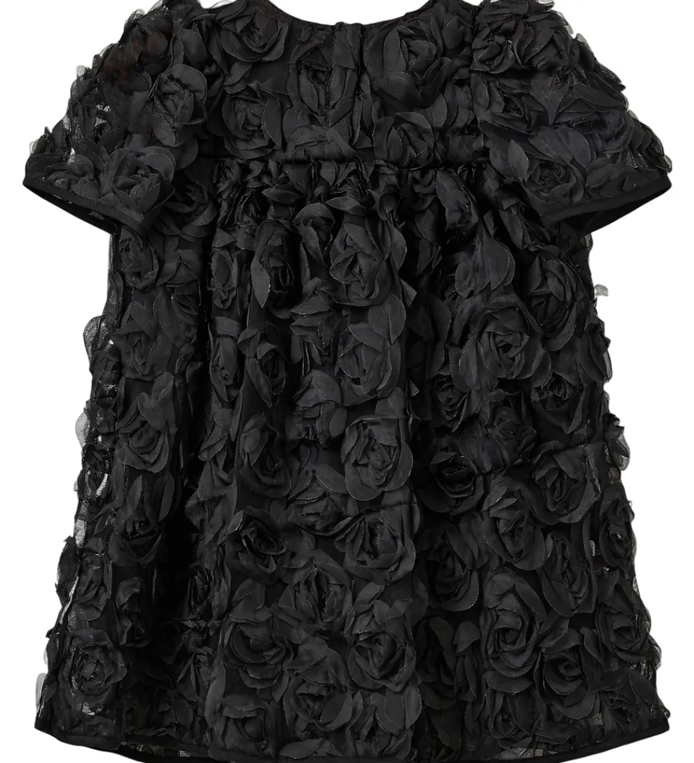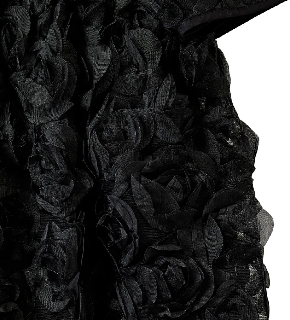 Elegant Sofie Schnoor tylkjole i sort med et imponerende rosenmønster af tyl. Sofie Schnoor tylkjolen har korte ærmer og en rund halsudskæring. Alle overflader er dækket af detaljerede blomsterapplikationer, der skaber et tredimensionelt udtryk.