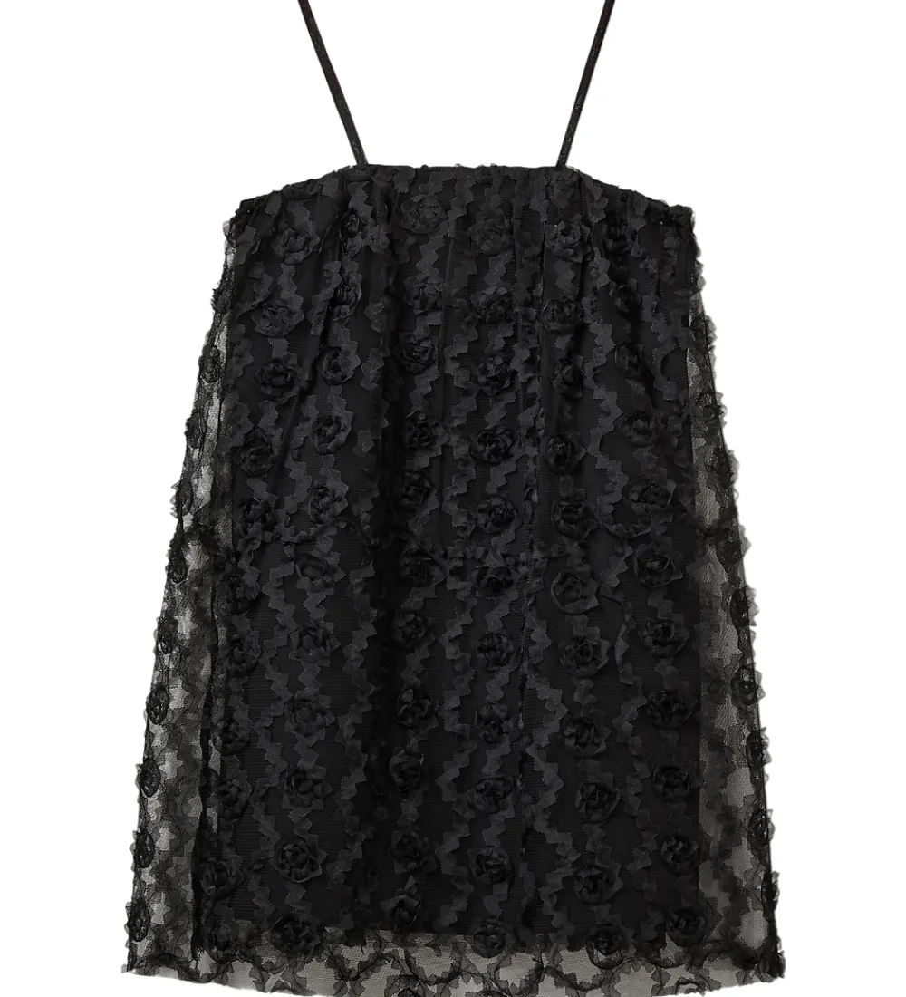 Sofie Schnoor tylkjolen har fine spaghettistropper og er dekoreret med et smukt blomsterreliefmønster, der giver et sofistikeret udtryk. Tylkjolens let gennemsigtige lag tilføjer en unik dimension til designet.