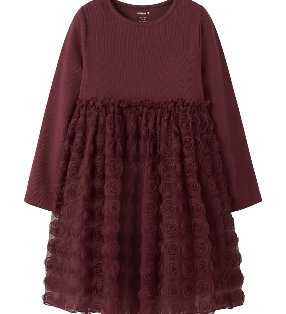 Elegant Name It kjole i en dyb bordeaux farve. Name It kjolen har lange ærmer, og toppen er lavet af blødt bomuld med rbstruktur. Nedenunder falder tylskørtet med masser af vidde, og det er dekoereret med massvis af roser lavet af tyl.