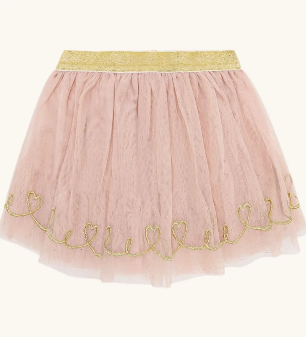 Fin Hust and Claire nederdel i rosa tyl med guldprikker, og langs kanten af skørtet er der broderet en stribe af guld, som former som hjerter. I livet har den en kant med guldglimmer, og nedenunder falder skørtet med masser af vidde. På indersiden er der et ekstra lag af bomuldsjersey, så tylnederdelen ikke fremstår gennemsigtig.