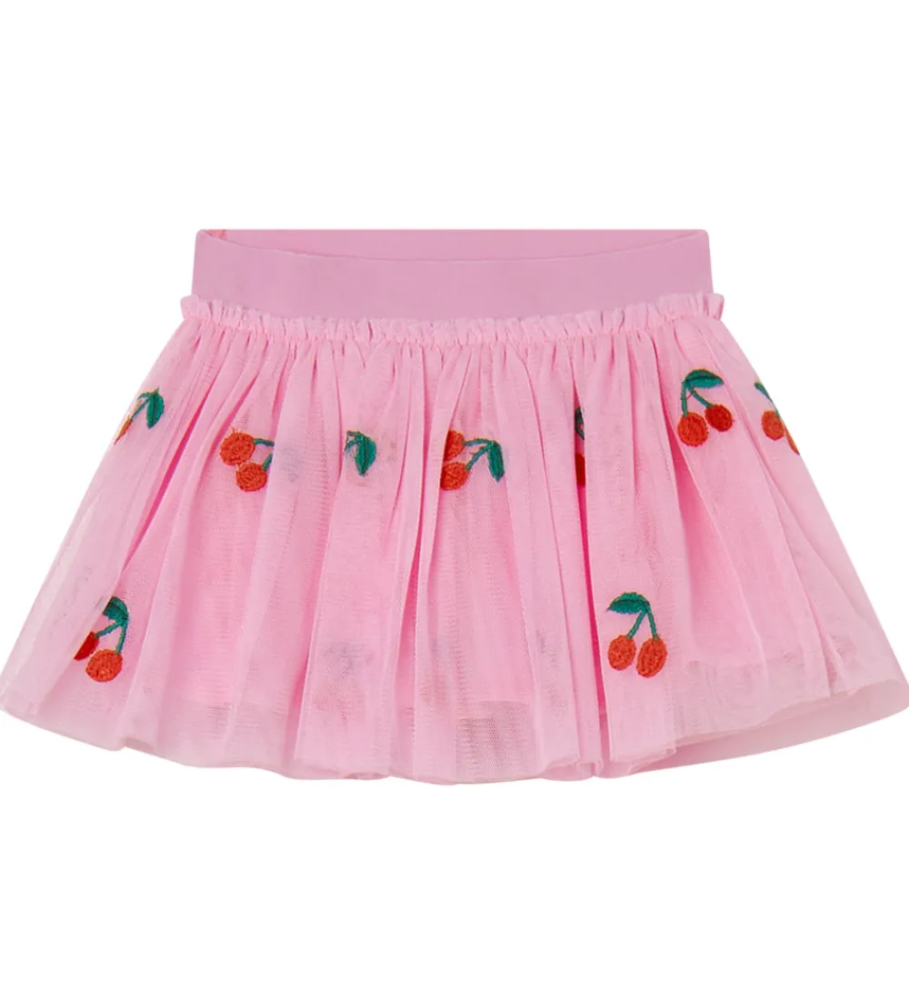 Lækker Stella McCartney Kids nederdel i pink tyl med fine broderede kirsebær i rød og grøn. Nederdelen har en bred elastik i livet, og på indersiden er der et ekstra lag af fastvævet viskose. Tylnederdelen har et let og luftigt design, perfekt til leg og bevægelse.