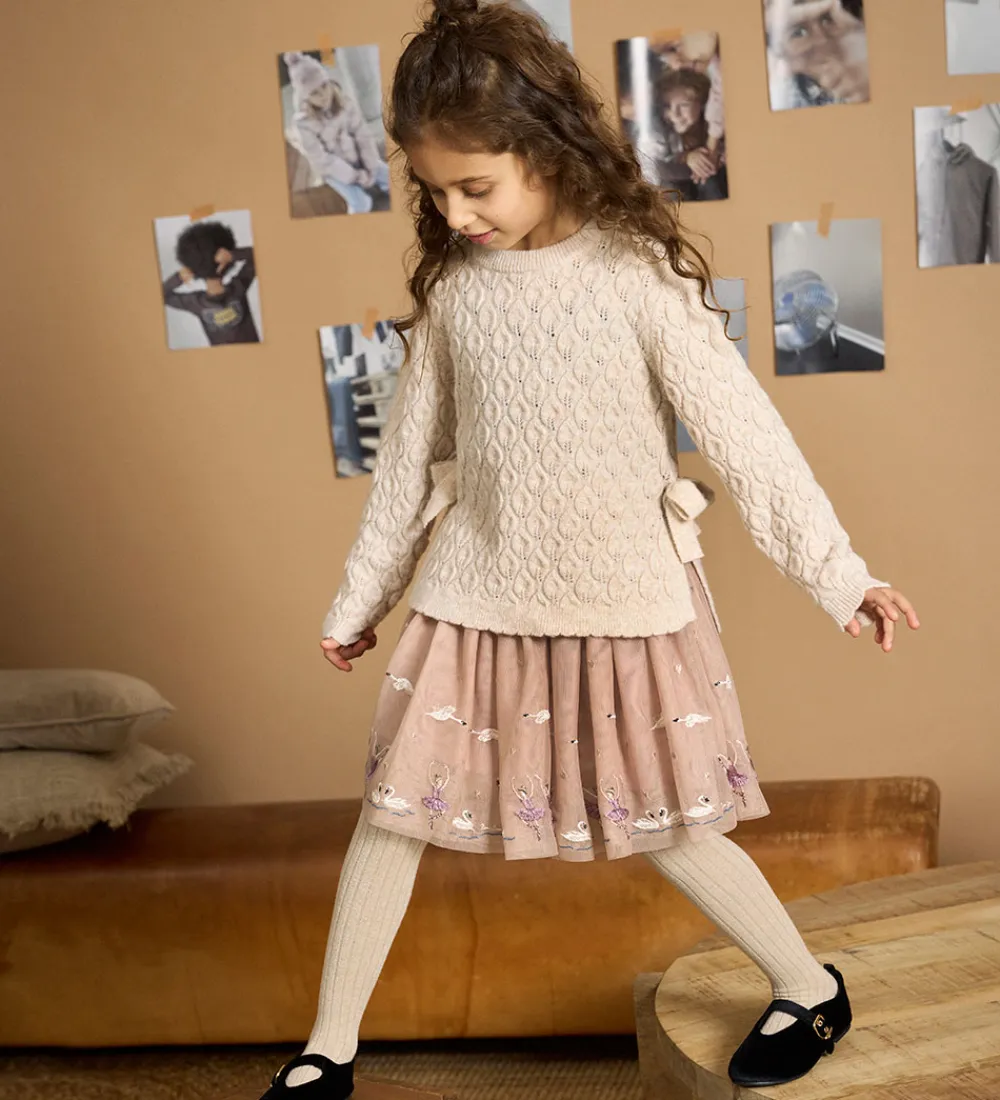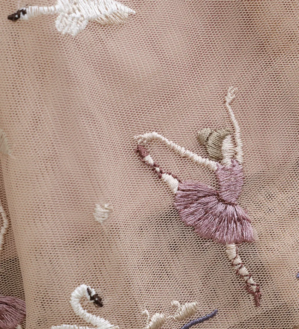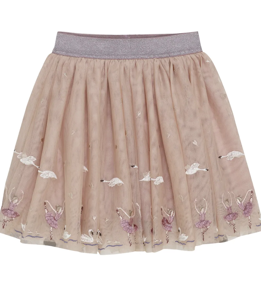 Fin tylnederdel fra Minymo i lys rosa, og langs den nederste kant er der broderet hvide svaner og ballerinaer med rosa strutskørter. I livet har den sølvfarvet med glimmer.