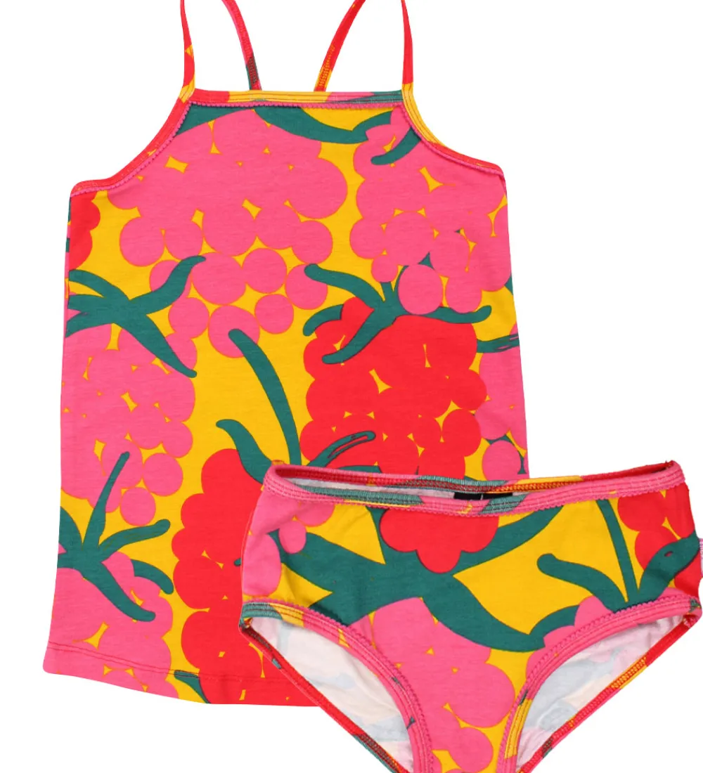 Farverigt Danefæ undertøj med en tanktop og trusser med blomstermotiv i pink og gul, med lyse grønne detaljer. Det er en sjov og livlig tilføjelse til garderoben.