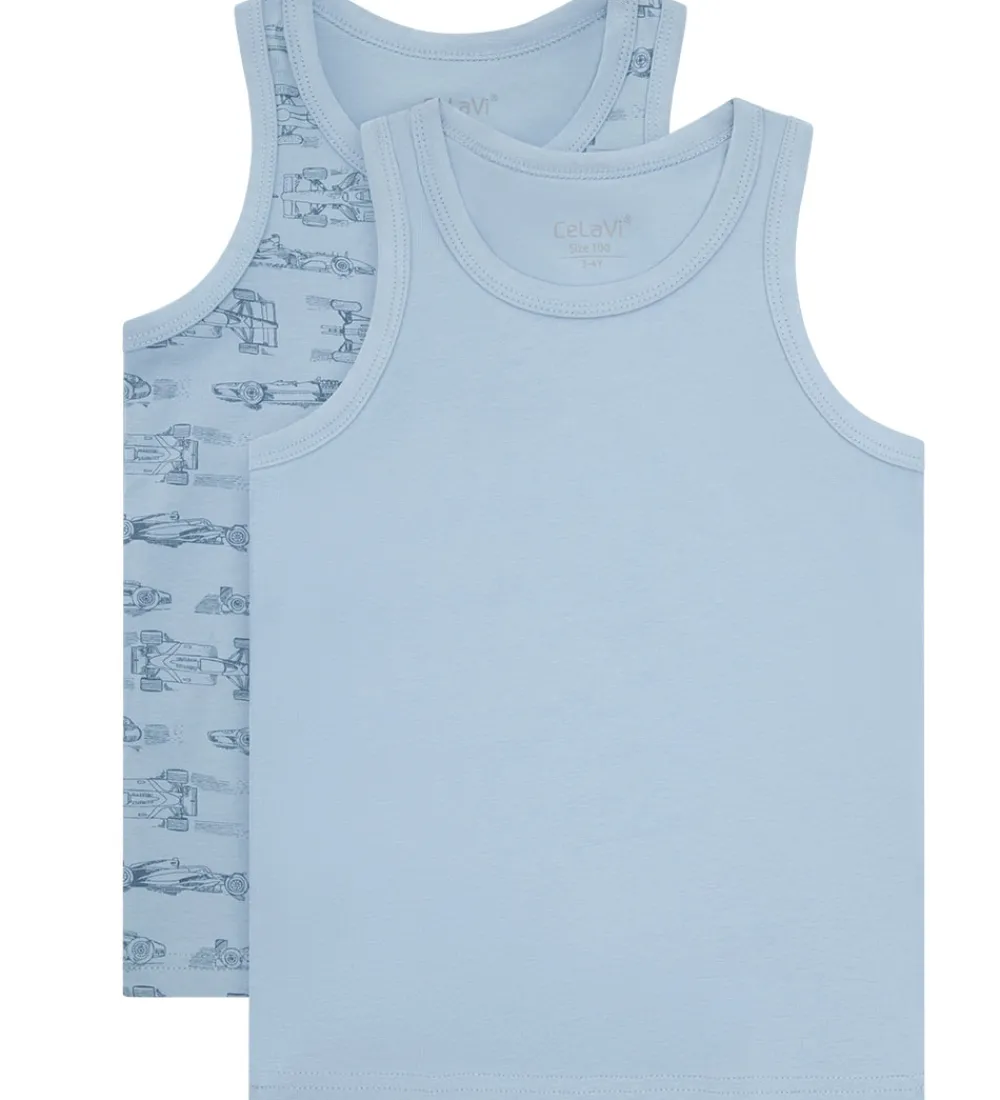 Lækre CeLaVi undertrøjer solgt i en 2-pak. Den ene undertrøje er ensfarvet lyseblå, mens den anden er lyseblå med et alloverprint af racerbiler i mørkeblå. Undertrøjerne har brede skulderstropper og rund halsudskæring.