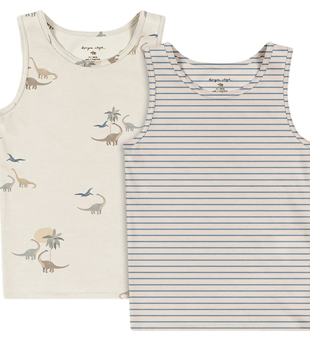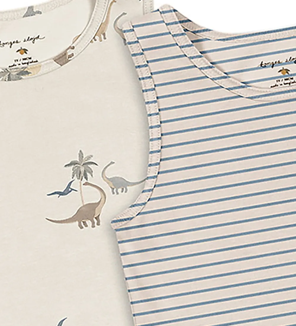 Flotte Konges Sløjd undertrøjer solgt i en 2-pak. Den ene undertrøje er cremefarvet med et charmerende dinosaurprint, mens den anden er hvid med blå striber. Begge undertrøjer har brede stropper og rund hals.