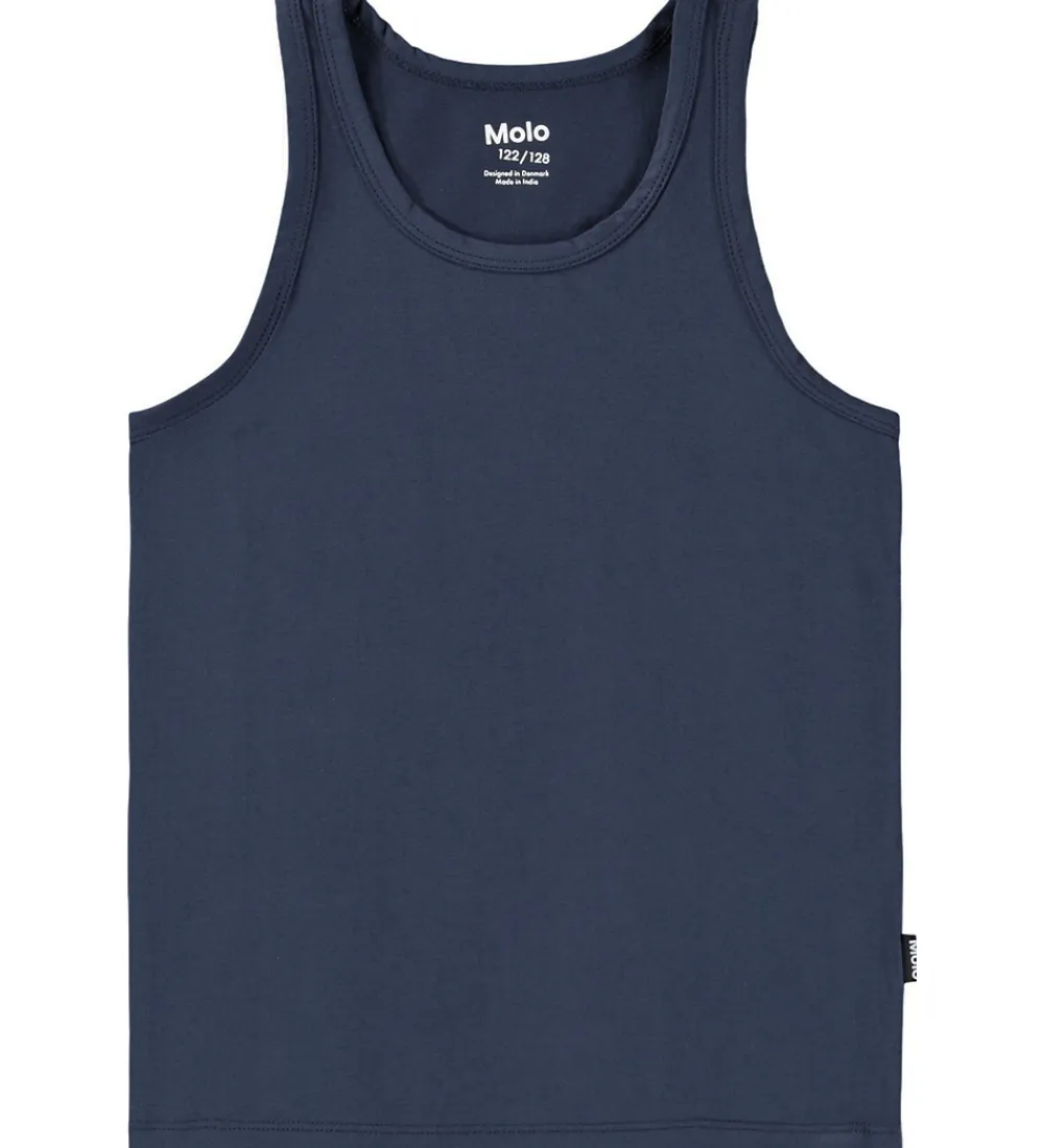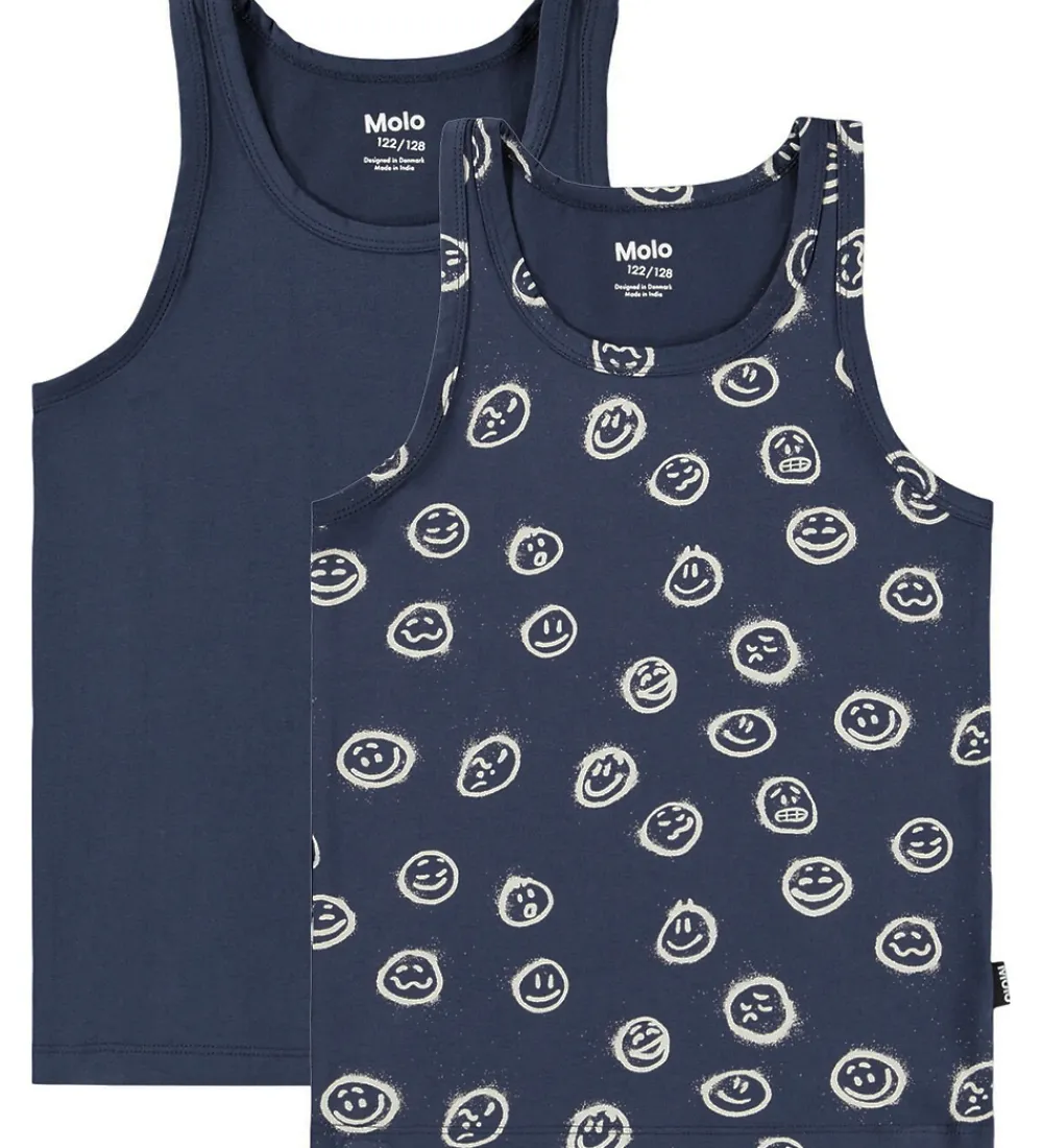 Flotte Molo undertrøjer, som sælges i en 2-pak. Den ene er ensfarvet mørkeblå, mens den anden har et legende print med forskellige ansigter i lyse nuancer. Begge undertrøjer har en enkel og tidløs rund halsudskæring. Molo tilbyder her et sæt med stilfulde detaljer, der skaber variation i garderoben.