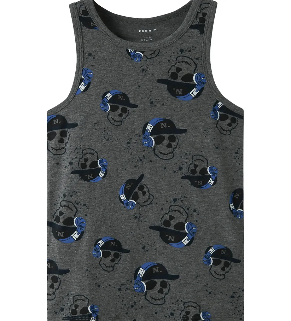 Smarte Name It undertrøjer i en 2-pak, en i mørkegrå med print og en ensfarvet mørkeblå. Begge undertrøjer har brede stropper og rund hals. Name It sikrer en stilfuld og praktisk løsning til hverdagens behov.