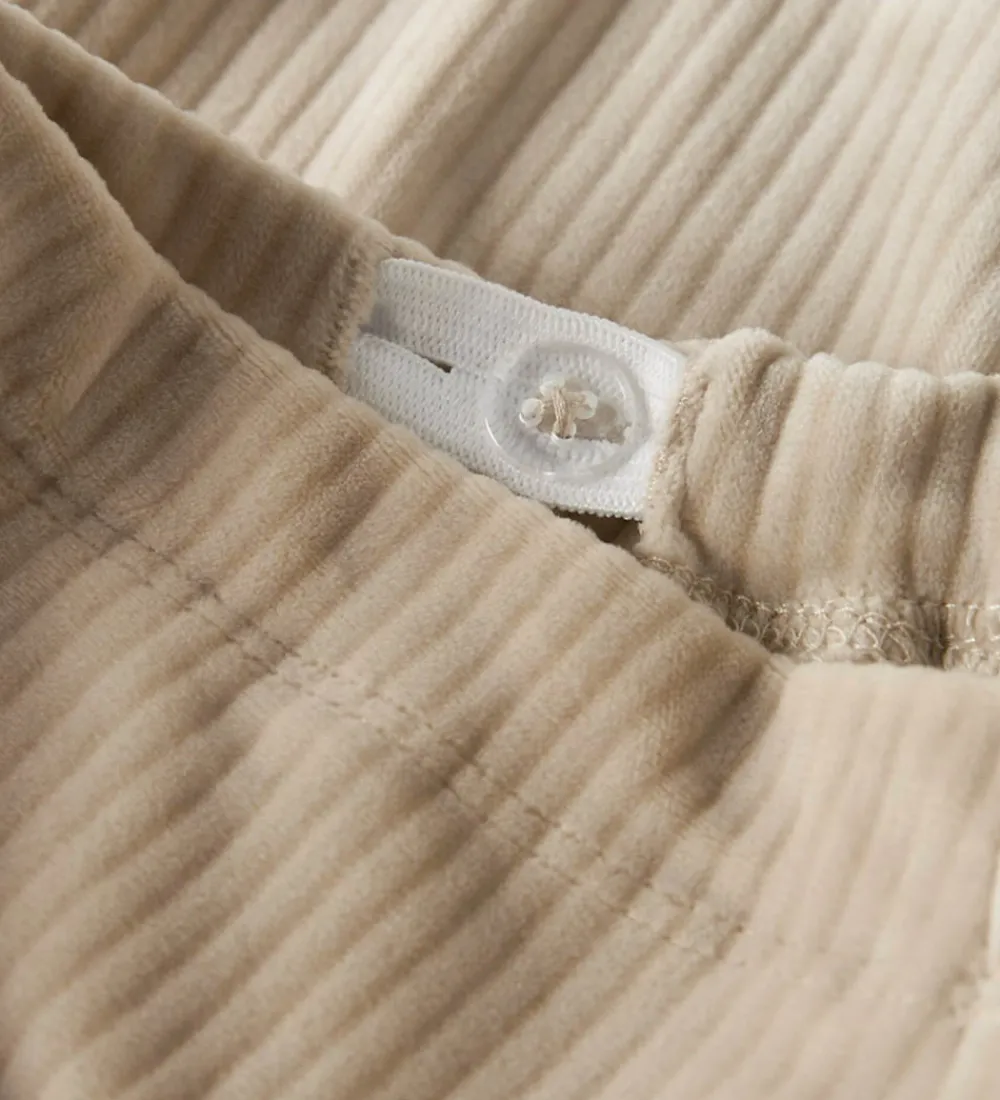 Stilfulde Name It velourbukser i en varm, beige nuance med diskrete, lodrette striber. Name It velourbukserne er udstyret med en elastisk talje, der sikrer en god pasform. Benenes afslutning er lige og elegant, hvilket understreger et moderne look i velourbukserne.