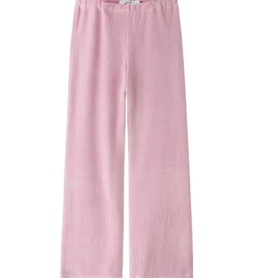 Yndige Name It velourbukser i en sart, rosa nuance med en elegant, rillet tekstur. Name It velourbukserne har en komfortabel elastisk talje og lange, lige ben, der afsluttes med en lige kant, hvilket skaber en afslappet silhuet.