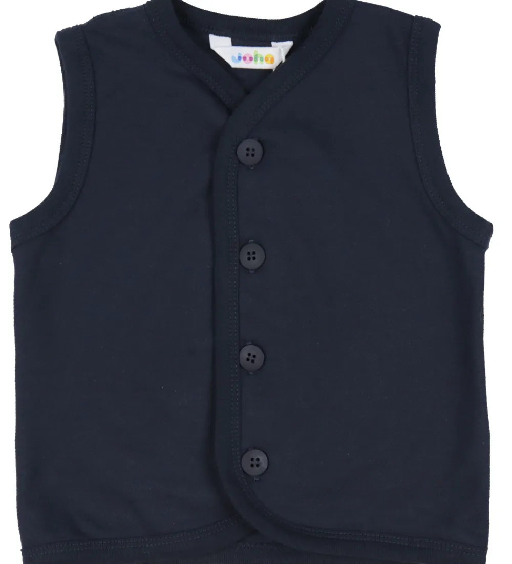 Joha vesten er uden ærmer og lukkes med store knapper fortil.