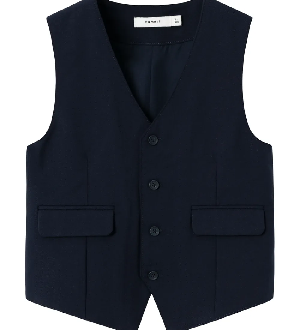 Stilfuld Name It vest i en elegant mørkeblå farve. Name It vesten har knaplukning på fronten og praktiske lommer, der fuldender det klassiske udtryk. Perfekt til at give ethvert outfit et løft.