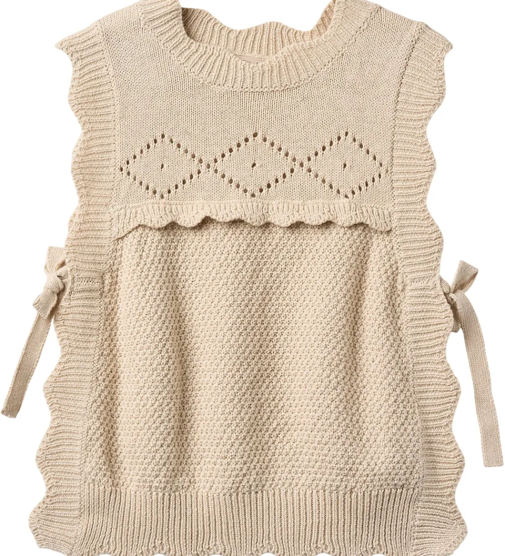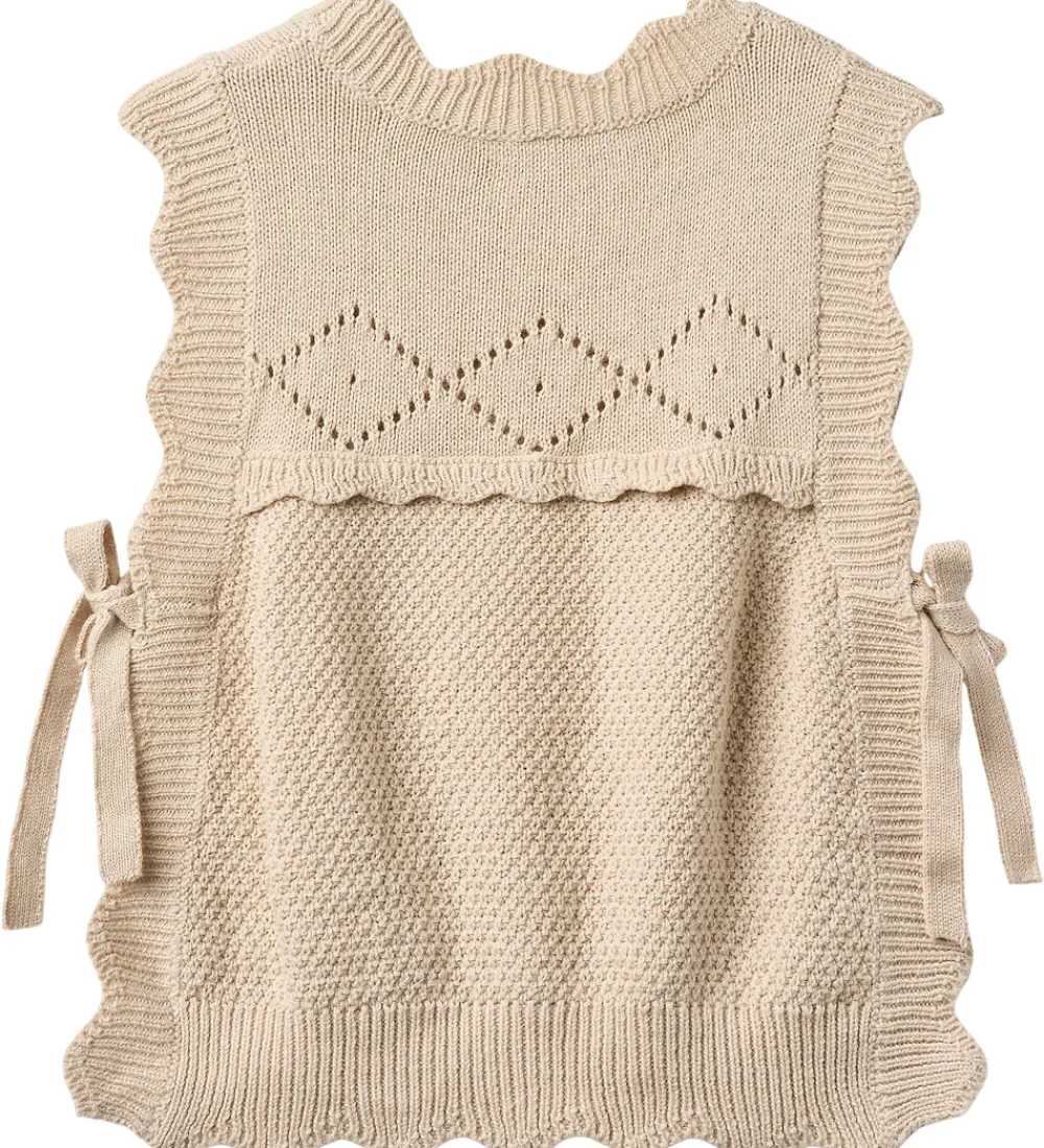 Charmerende Fliink vest i en lys beige nuance med flot strikket struktur. Vesten har et flot hulmønster øverst og i siderne er der bindebånd, som samler vesten under ærmerne. Vesten har en rund halsudskæring og bølgede kanter langs åbningerne.