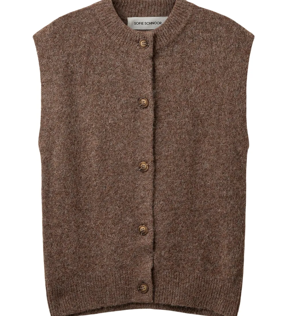 Flot Sofie Schnoor vest i smuk meleret brun strik.