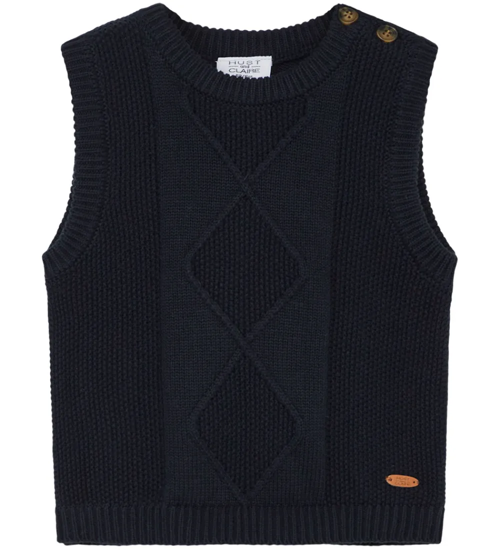 Lækker Hust and Claire vest i ensfarvet, navy strik med flot mønster på fronten.