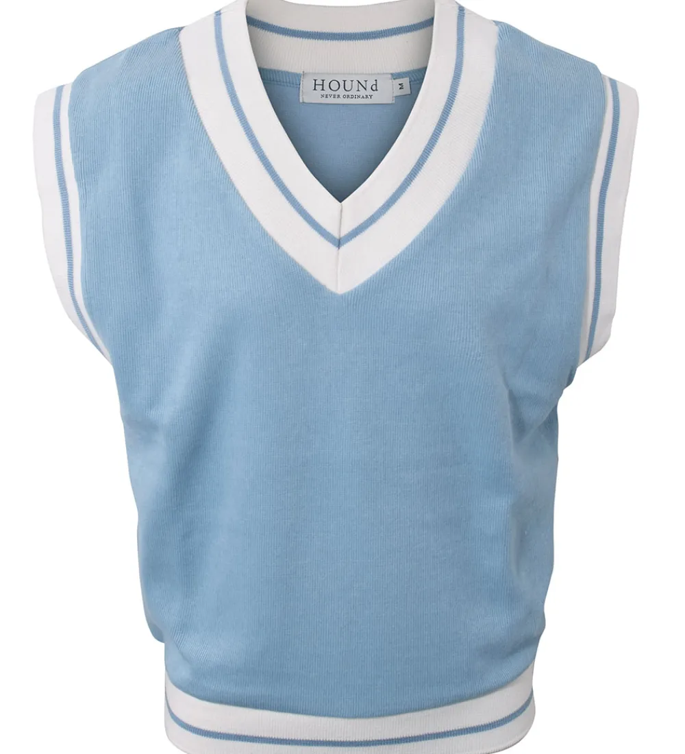 Klassisk Hound vest i en blød lyseblå strik med hvide kanter. Perfekt til at fuldende et moderne outfit.