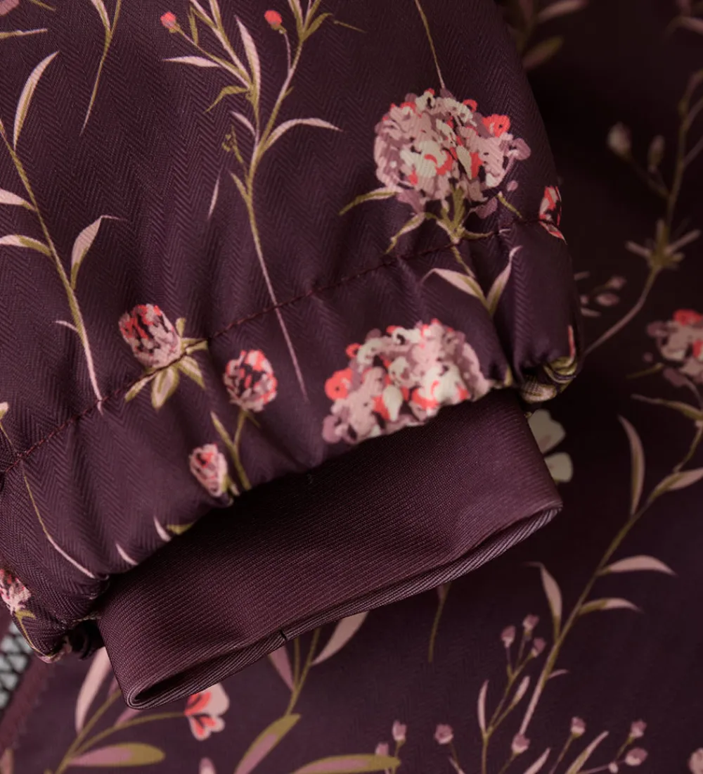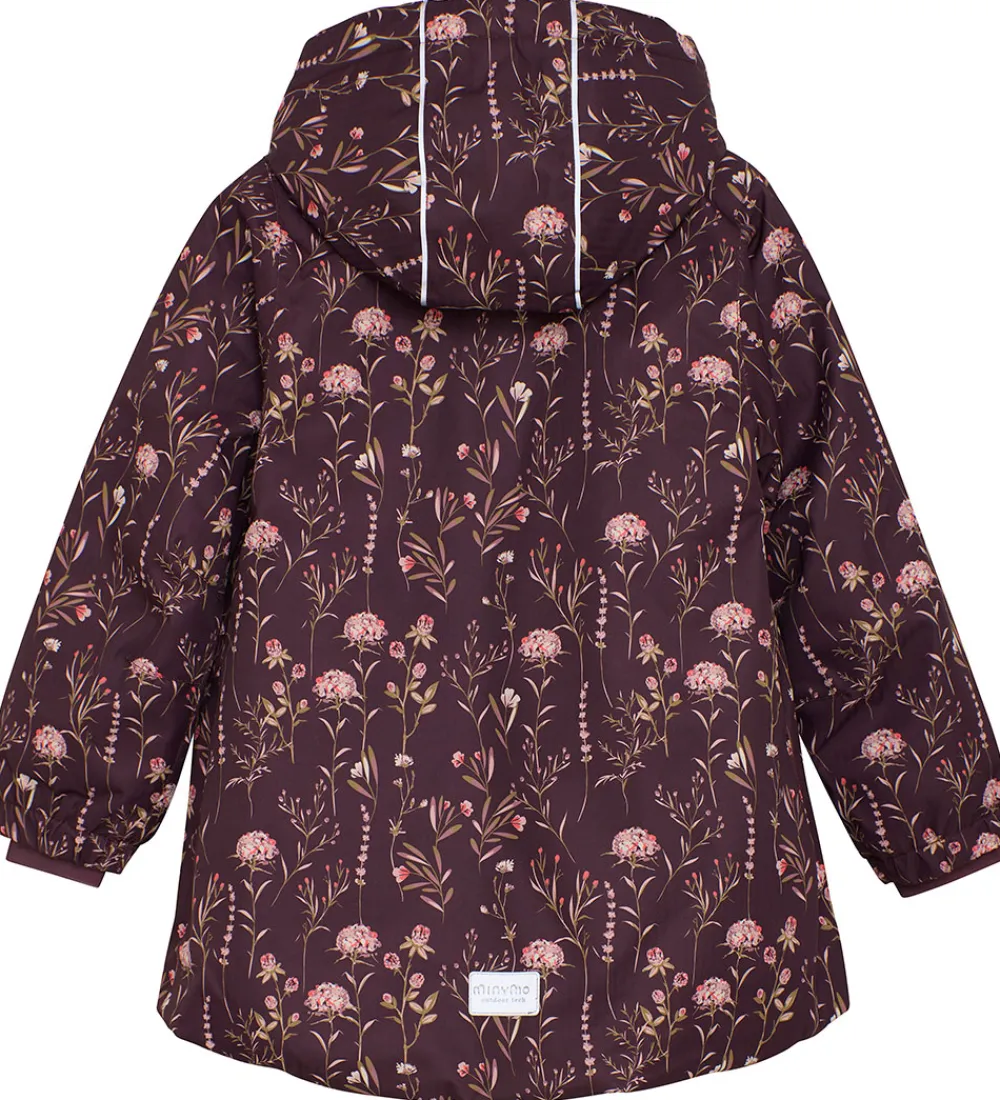Fin Minymo vinterjakke i mørk lilla med et alloverprint af blomster i rosa, lilla og grønne nuancer. Vinterjakken har refleksdetaljer på hætten og på ryggen.