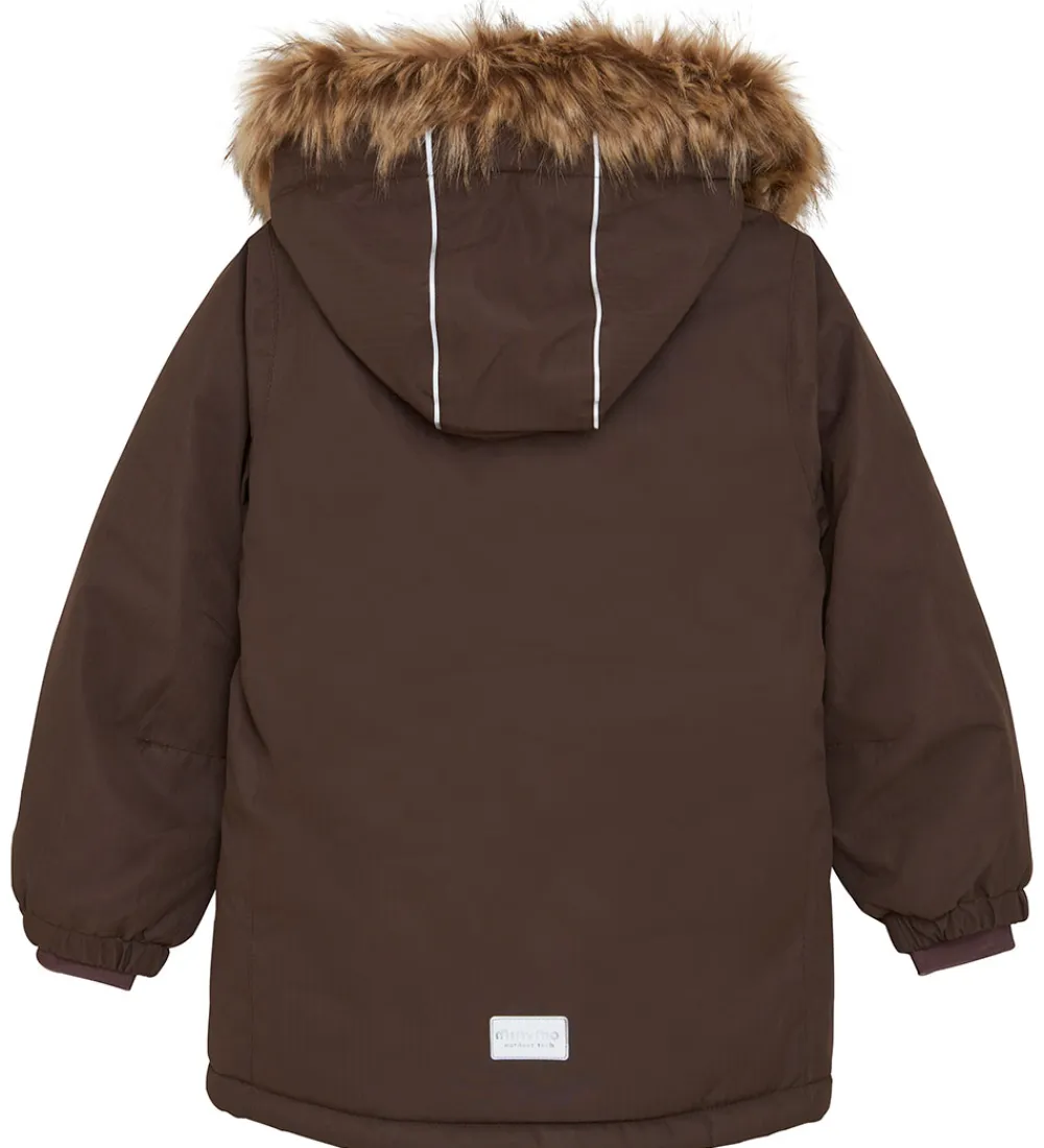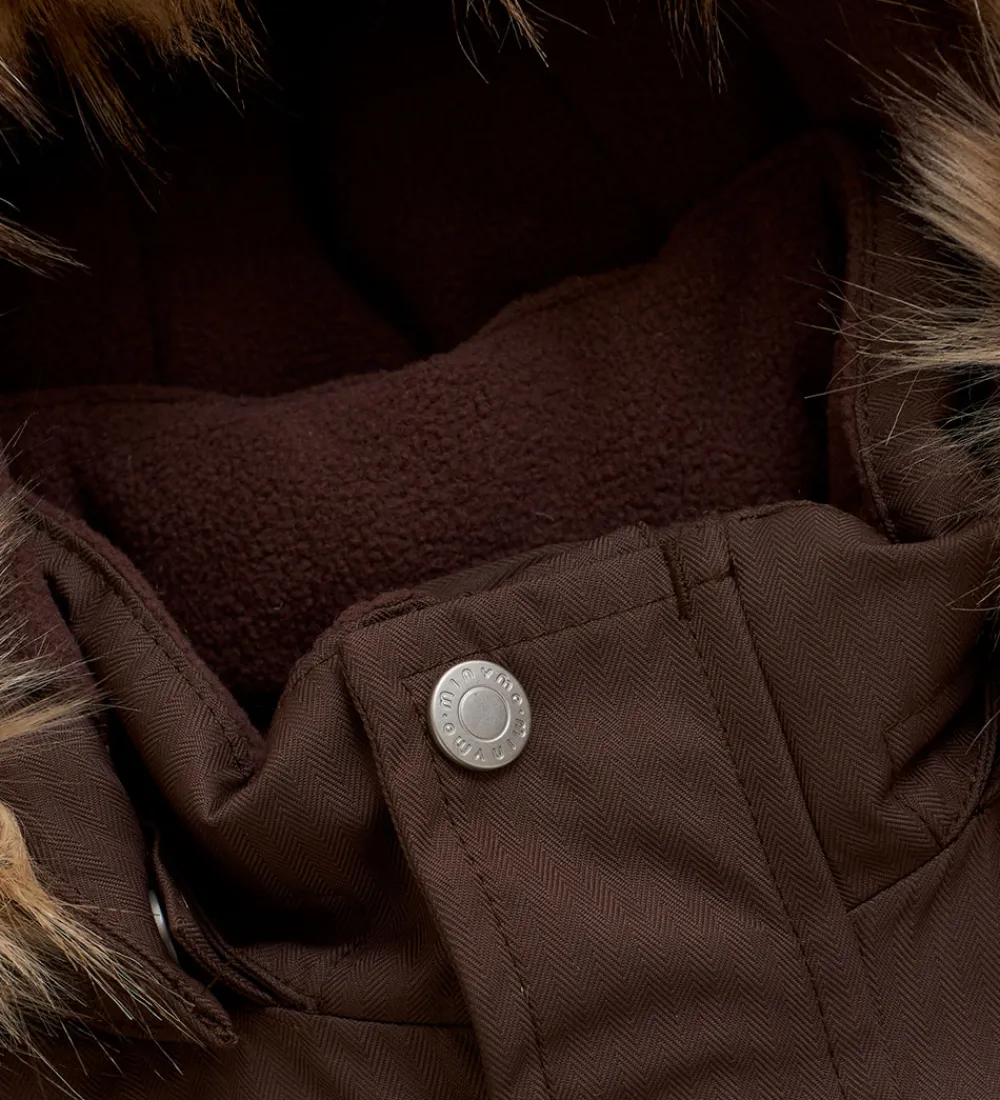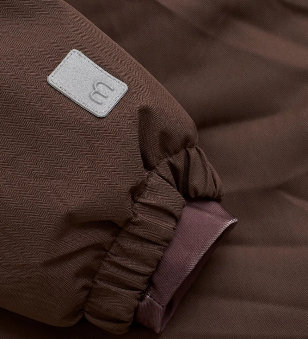 Skøn Minymo vinterjakke i brun med refleksdetaljer på hætten og på ryggen.