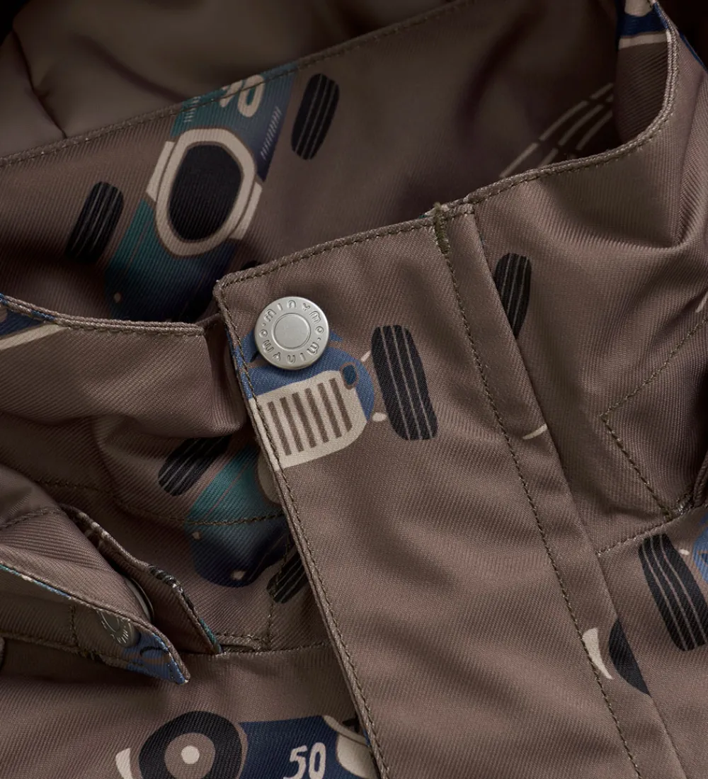 Smart Minymo vinterjakke i brun med et alloverprint af racerbiler i blå og grønne nuancer. Vinterjakken har praktiske refleksdetaljer.