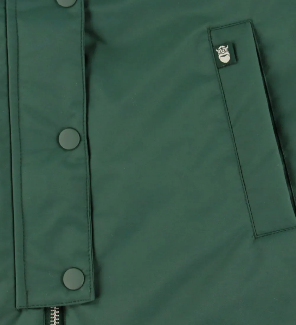 Funktionel Danefæ vinterjakke i mørkegrøn med refleksdetaljer på ærmerne og et stort refleksprint af en viking på ryggen. Vinterjakken har en aftagelig hætte, som sidder fast langs kravens kant med trykknapper. Den har brede ribkanter i ærmeåbningerne, og lukkes med en gennemgående lynlås foran med hagebeskytter og dobbelt vindtolpe, hvoraf den yderste kan lukkes med trykknapper. Foran er der en lomme i hver side. Indvendigt er der hvidt, imiteret uld i kroppen og i hætten, mens der er qulitet struktur i ærmerne.