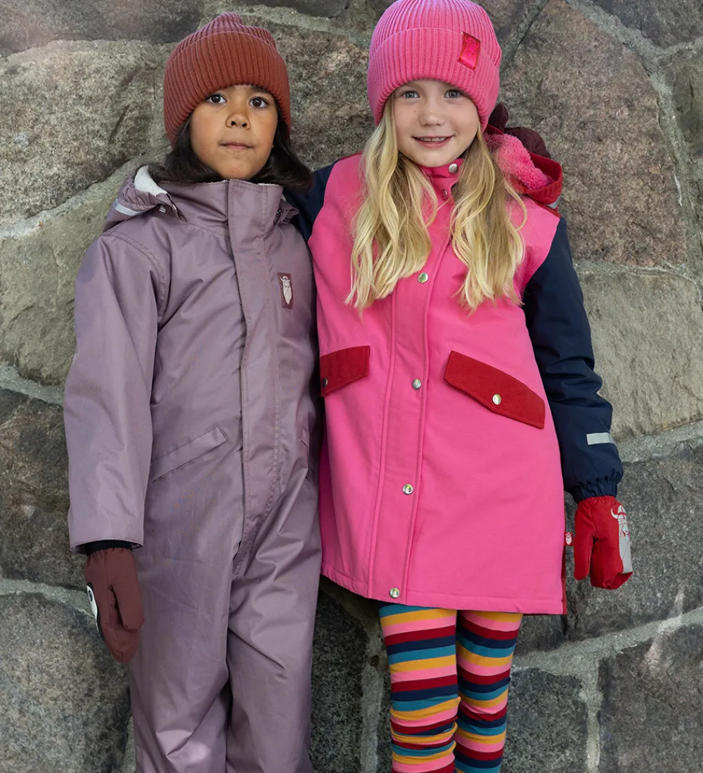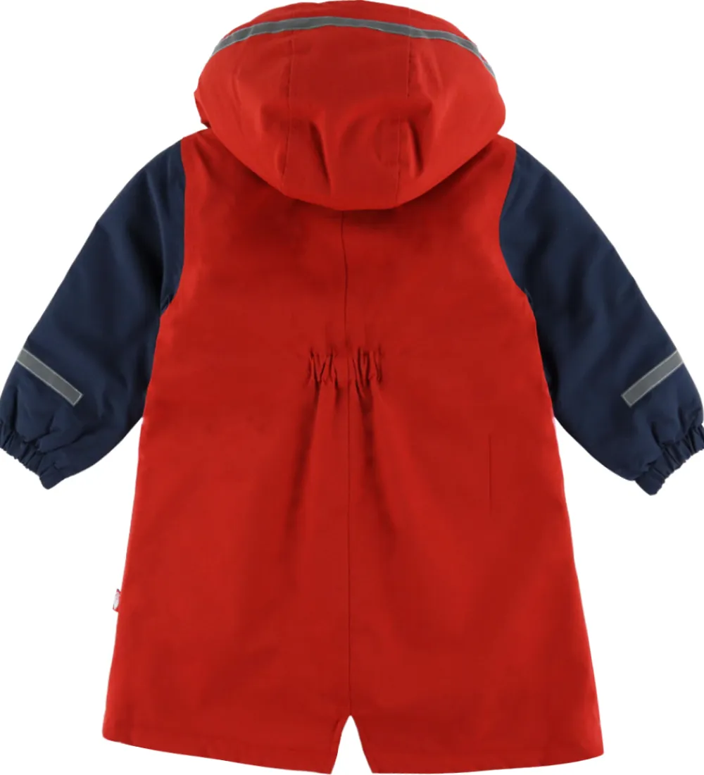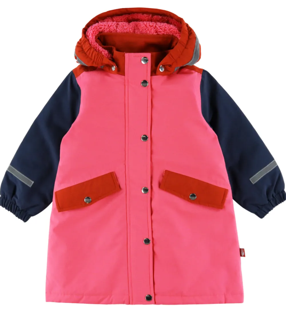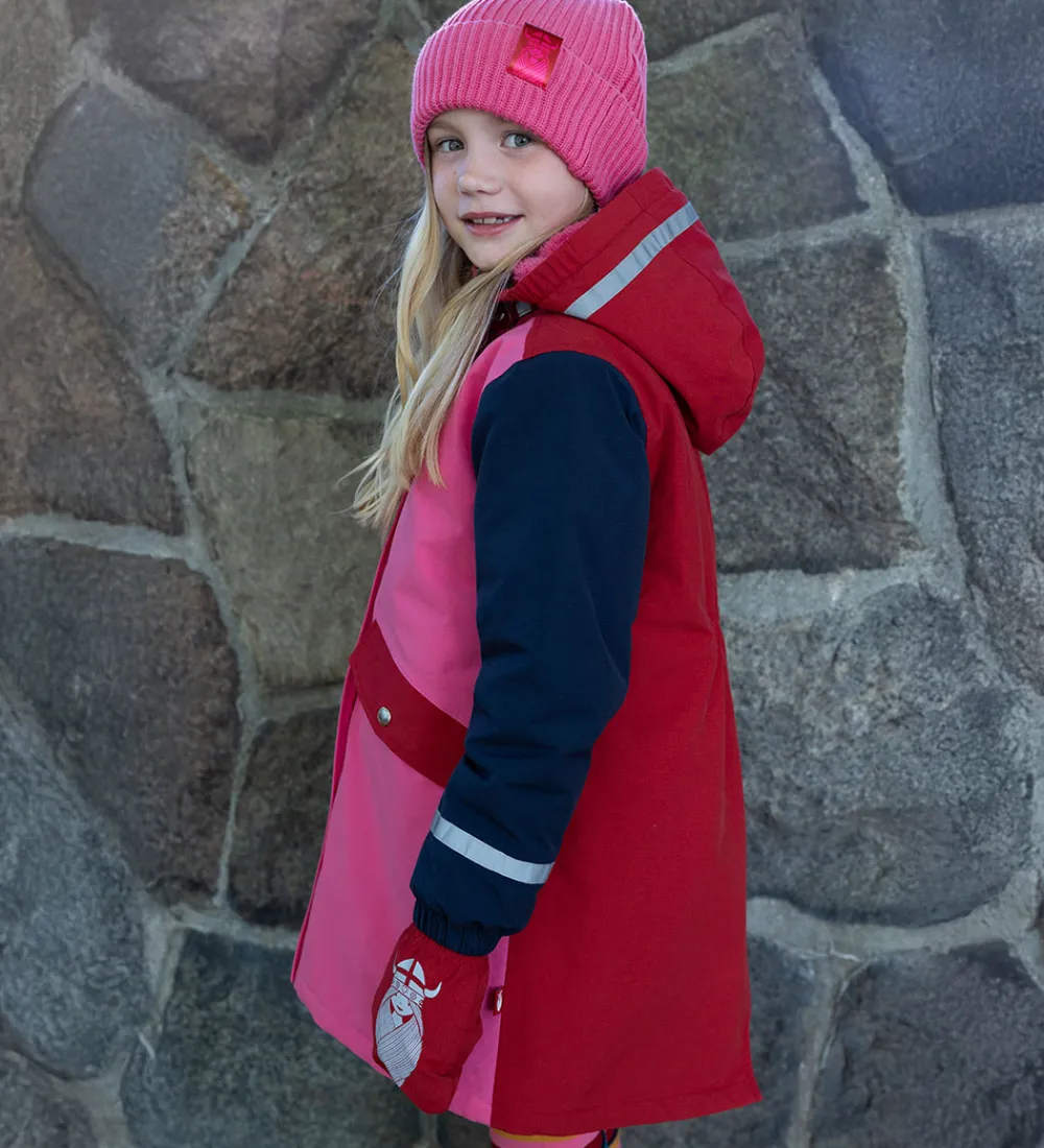 Fin Danefæ vinterjakke i en flot farvekombination af pink, rød og navyblå og med praktiske refleksstriber på velplacerede steder.