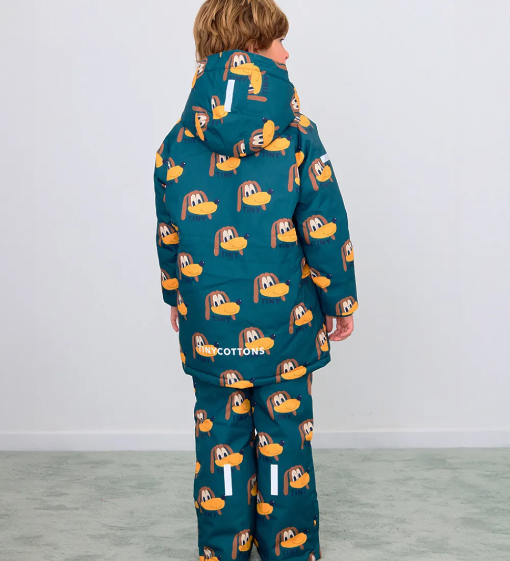 Flot Tiny Cottons vinterjakke i en petroleumsgrøn nuance med et charmerende hundeprint i gule og brune nuancer.
