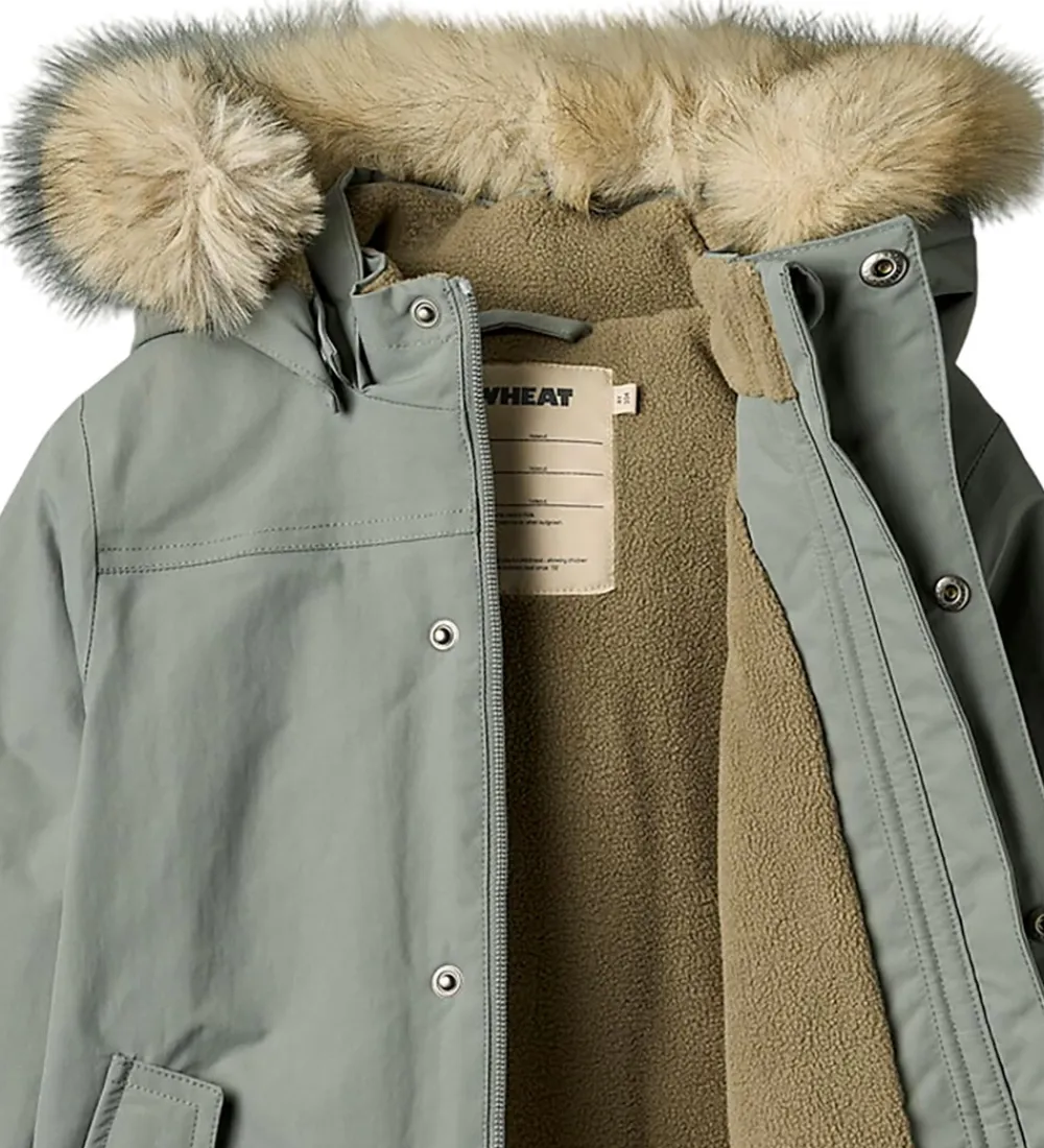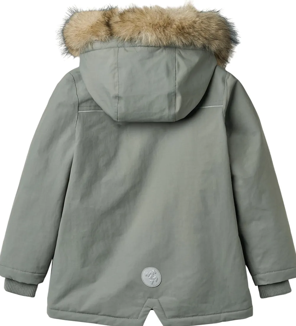Skøn Wheat vinterjakke i grågrøn og med en flot kant af imiteret pels på hætten.