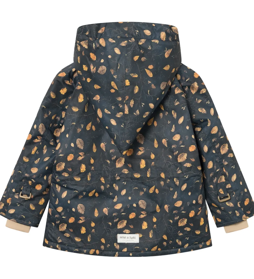 Dejlig Mini A Ture vinterjakke i mørkeblå med et alloverprint af efterårsblade i gyldenbrune nuancer. Vinterjakken er med beige for.