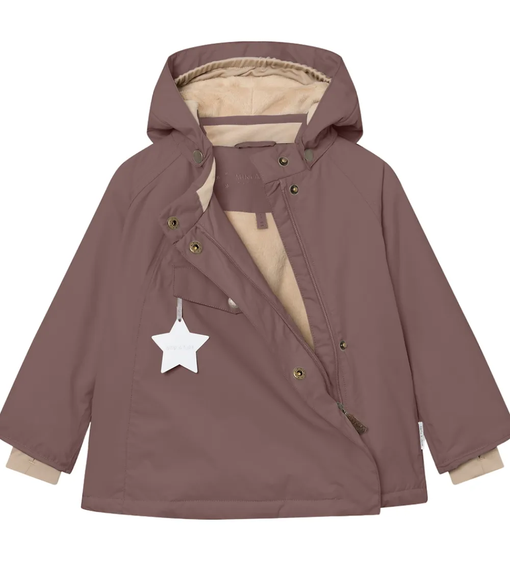 Dejlig Mini A Ture vinterjakke i mat, mørk blommelilla. Vinterjakken er med beige for.