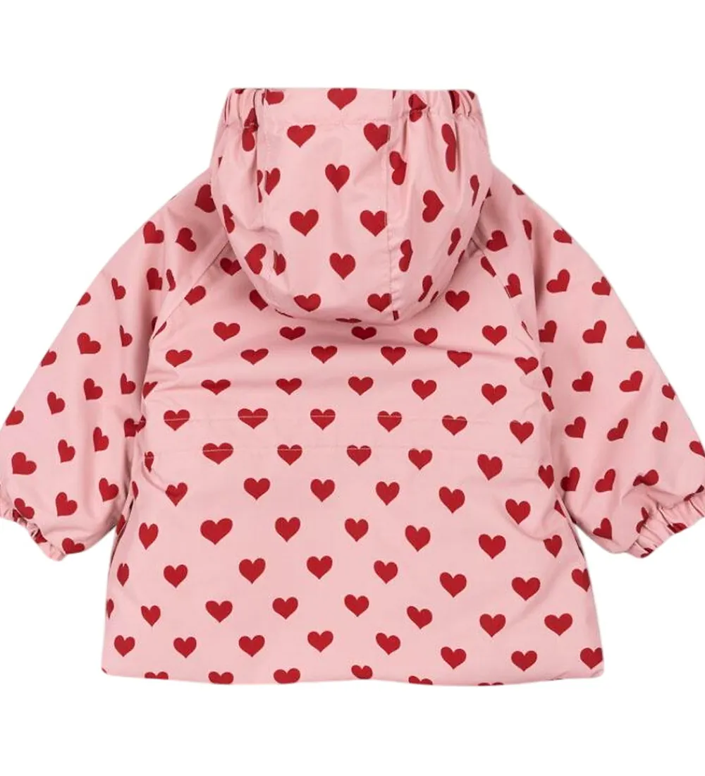Sød Konges Sløjd vinterjakke i rosa med et alloverprint af røde hjerter.