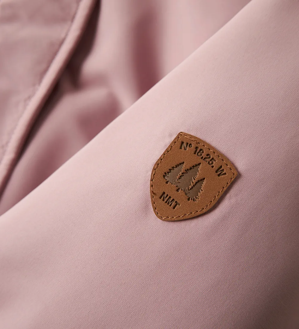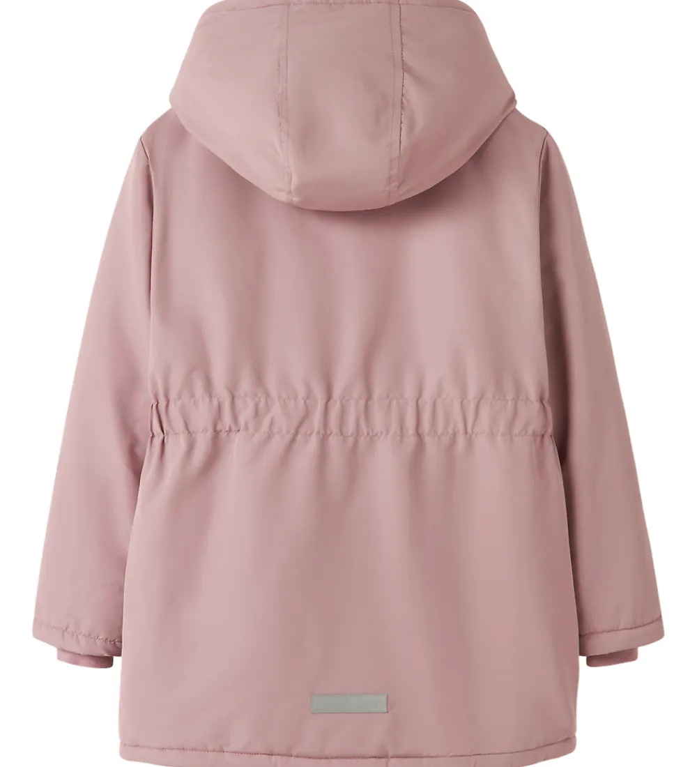 Name It vinterjakken har en aftagelig hætte, som sidder fast langs kraven med trykknapper. Vinterjakken lukkes fortil med en gennemgående lynlås med hagebeskytter og dobbelt vindstolpe, hvoraf den yderste kan lukkes med trykknapper. I ærmerne er der snefang med brede ribkanter. Fortil er der en lomme i hver side, som lukkes med trykknapper.