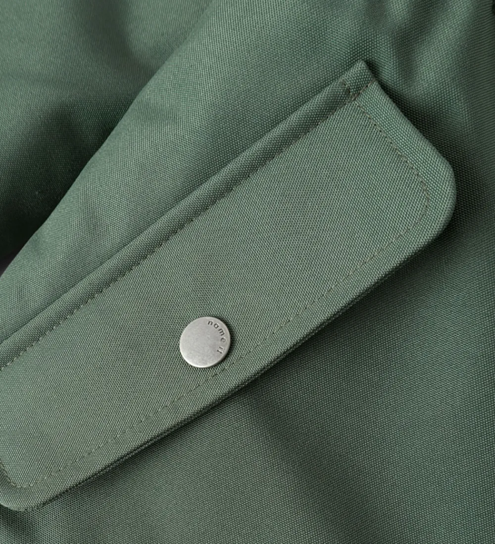 Name It vinterjakken er en lang parka-model. Den har en aftagelig hætte, som sidder fast med skjulte trykknapper omkring halskraven, og pelskanten kan tages af og på ved hjælp af små knapper. Ærmerne har snefang med brede ribkanter.