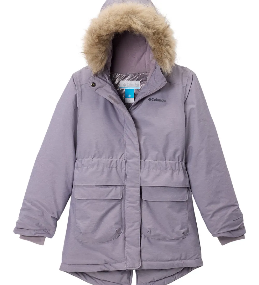 Smart Columbia vinterjakke i lilla med et lille logoprint på venstre bryst. Hætten har en flot kant af imiteret pels.