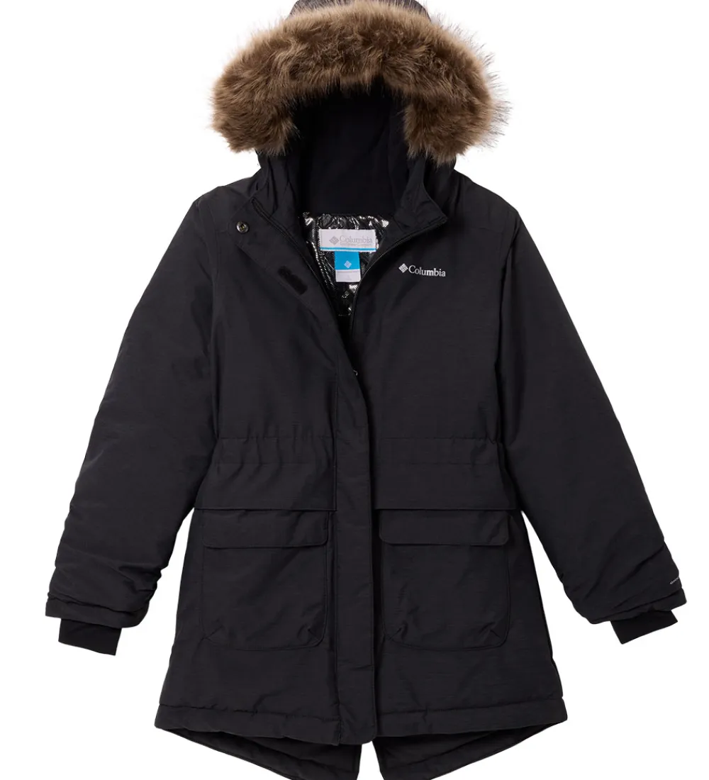Smart Columbia vinterjakke i sort med et lille, gråt logoprint på venstre bryst. Hætten har en flot kant af imiteret pels.