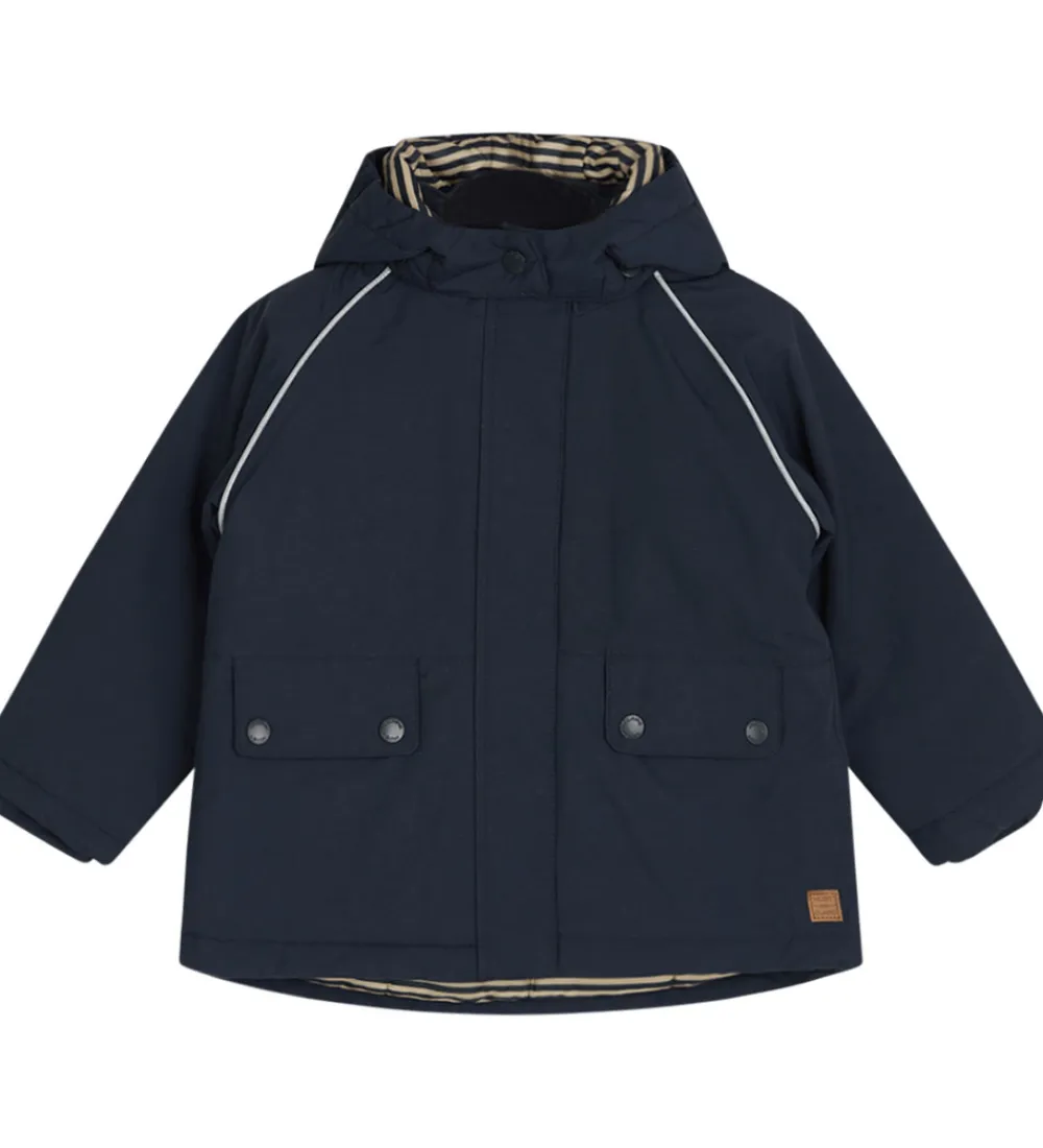 Vinterjakken er vatteret, og indvendigt er den foret med fleece i halskraven og ryggen, mens resten af vinterjakken har et glatvævet for med striber i beige nuancer.
