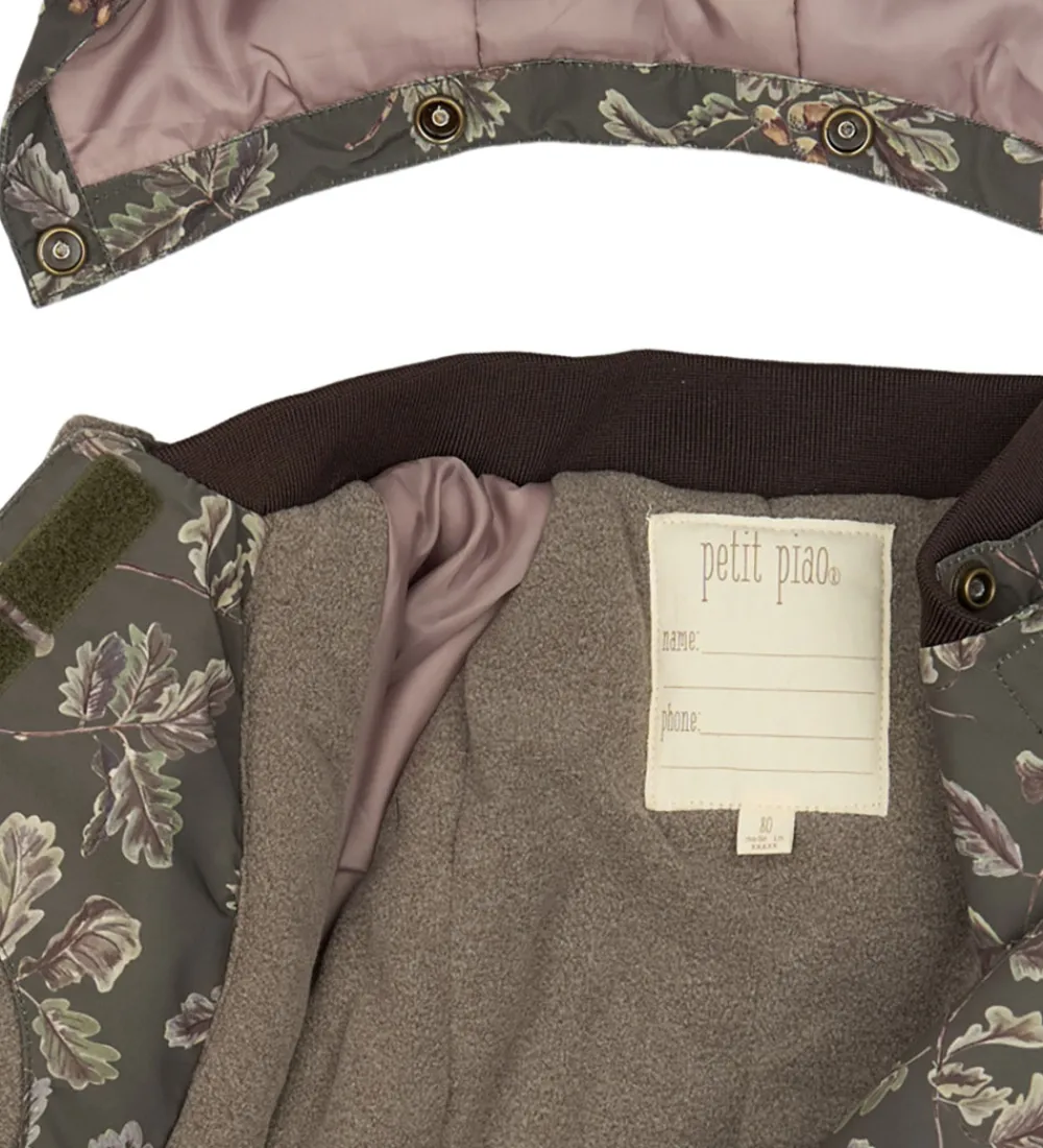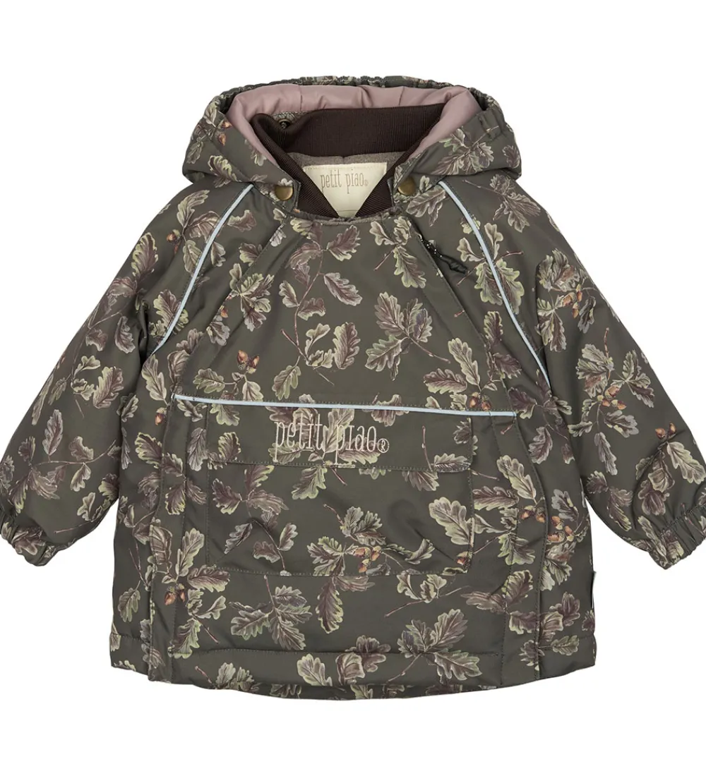 Skøn Petit Piao vinterjakke i mørkegrøn med et alloverprint af egeblade. Vinterjakken er med praktiske reflekspipings og et broderet logo fortil.