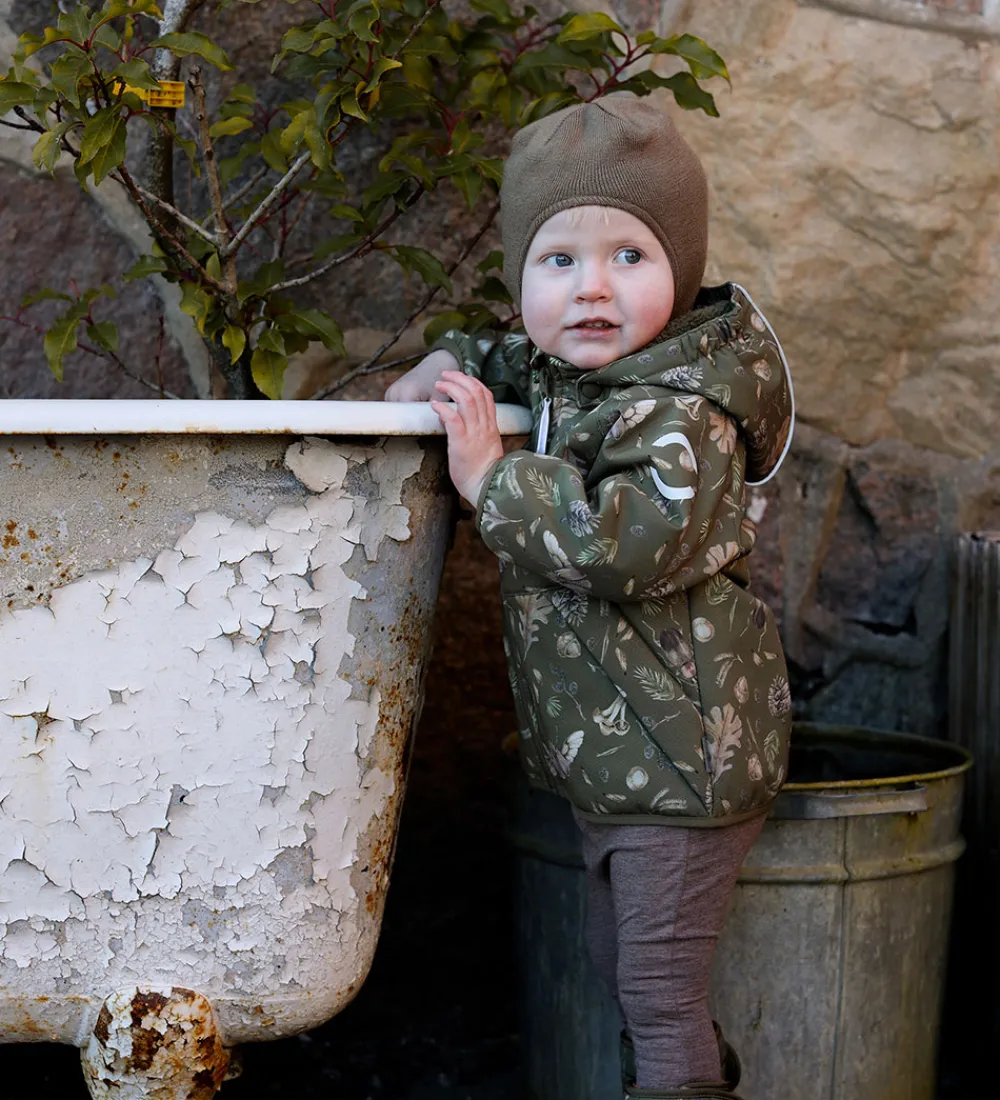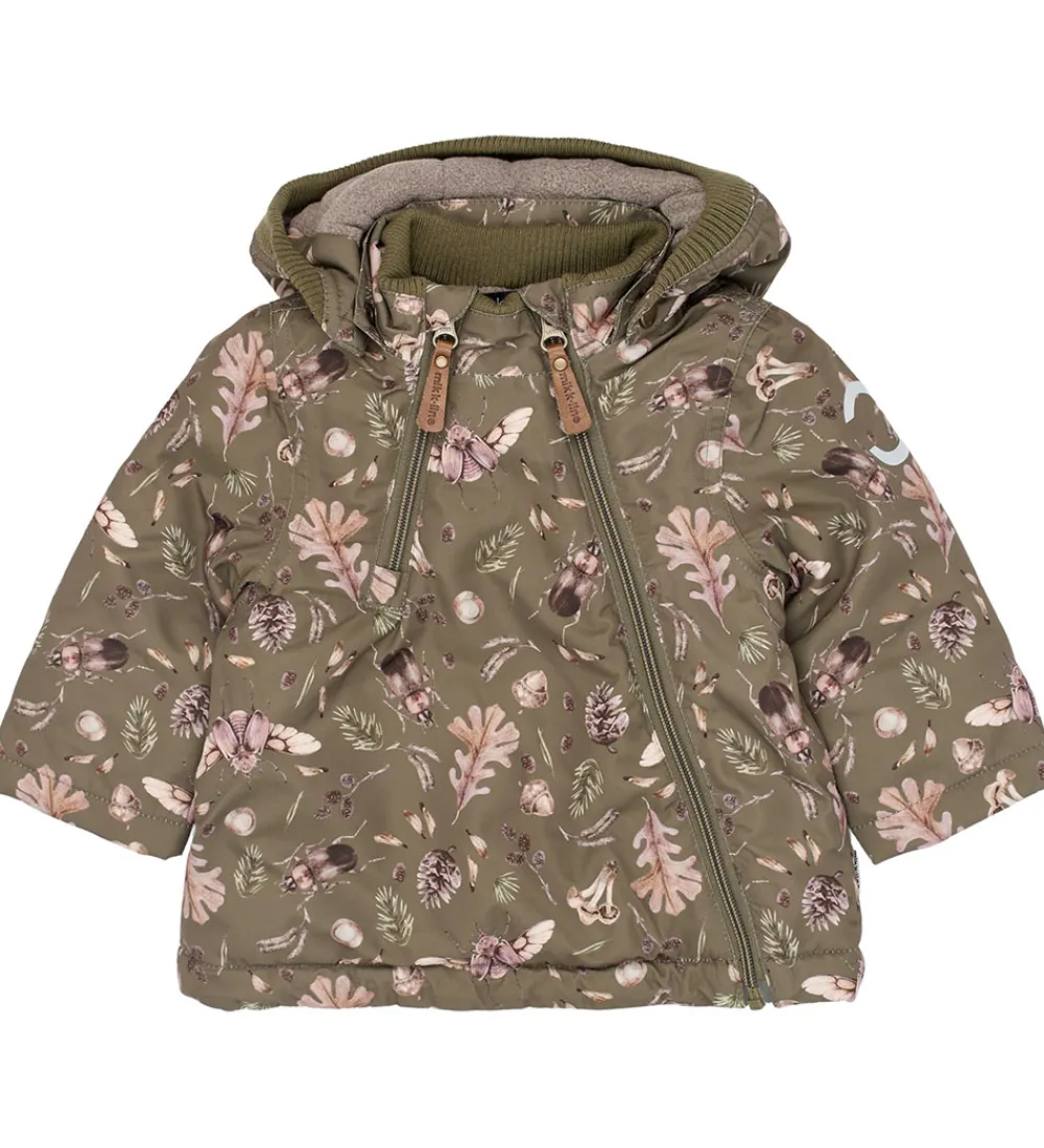 Flot Mikk-Line vinterjakke i mørkegrøn med et alloverskovprint med biller og blade i brune nuancer. Vinterjakken har også praktiske refleksprint.