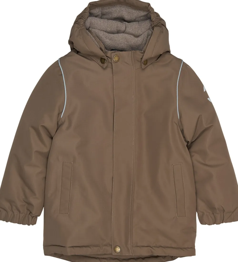 Pæn Mikk-Line vinterjakke i lysebrun. Vinterjakken har refleksdetaljer på hætten, nederst på ryggen og omkring skuldrene.
