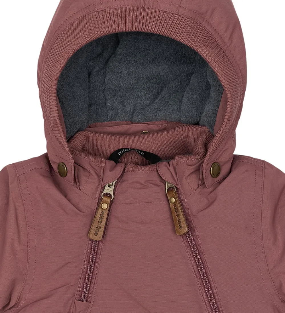 Mikk-Line vinterjakken åbnes fortil med to asymmetriske lynlåse. Den ene lynlås er kort, mens den anden lynlås er gennemgående fra hagen til venstre hofte. Begge lynlåse har hagebeskytter og indvendig vindstolpe og et fint læder vedhæng med logo. Indvendigt er der mørkegråt, blødt fleecefor i kroppen og i hætten, mens der er glatvævet for i ærmerne. Vinterjakken har en varm polyestervattering.