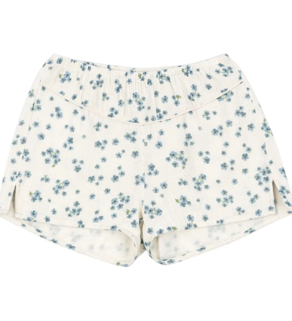 Elegante Konges Sløjd shorts i råhvid med blåt blomsterprint. Konges Sløjd shortsene har en kort model med elastisk talje og en kort slids i hver side.