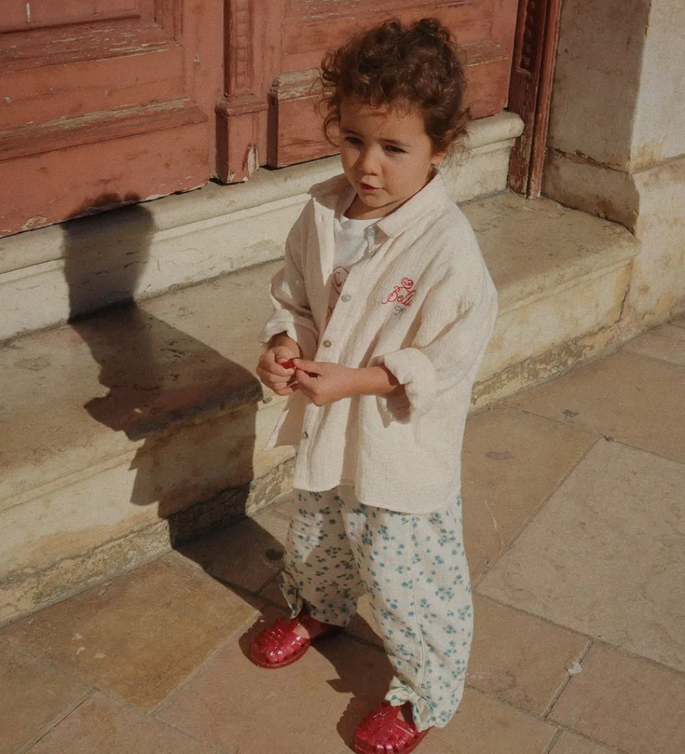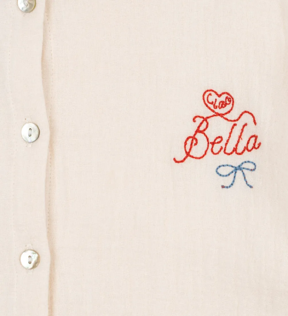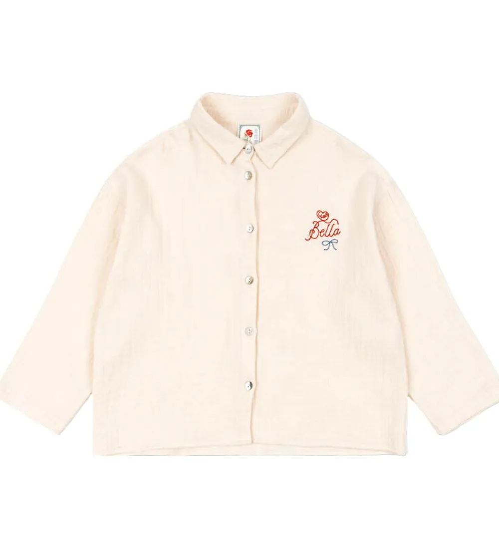 Charmerende Konges Sløjd skjorte i lys cremefarvet med musselinstruktur. På venstre bryst er teksten “Ciao Bella” broderet i rød. Skjorten har lange ærmer og en klassisk skjortekrave. Den lukkes fortil med gennemgående knapper.